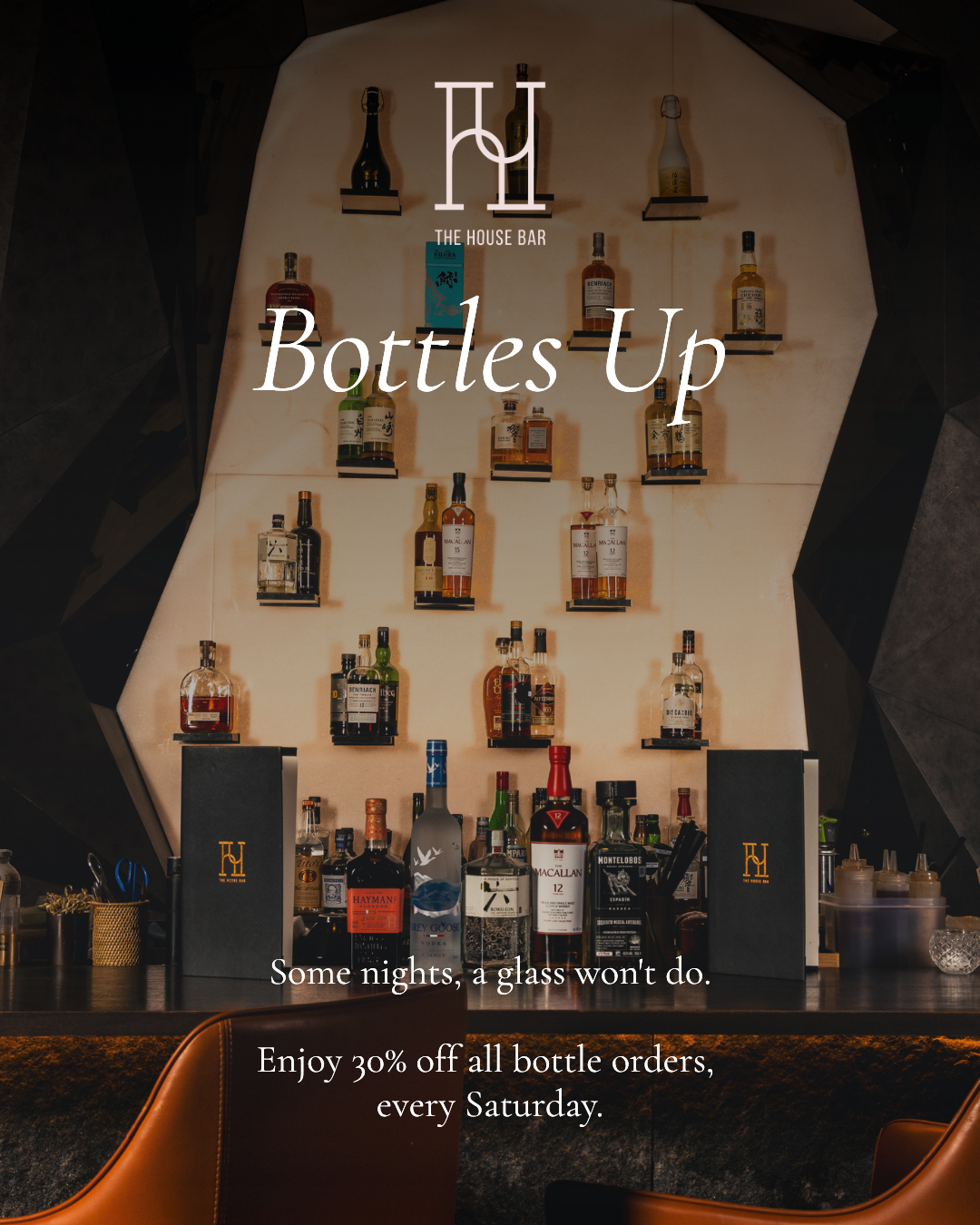 For those who prefer to settle in. Select any bottle from our spirits list and receive 30% off the bottle - a considered way to spend a Saturday evening with good company.
