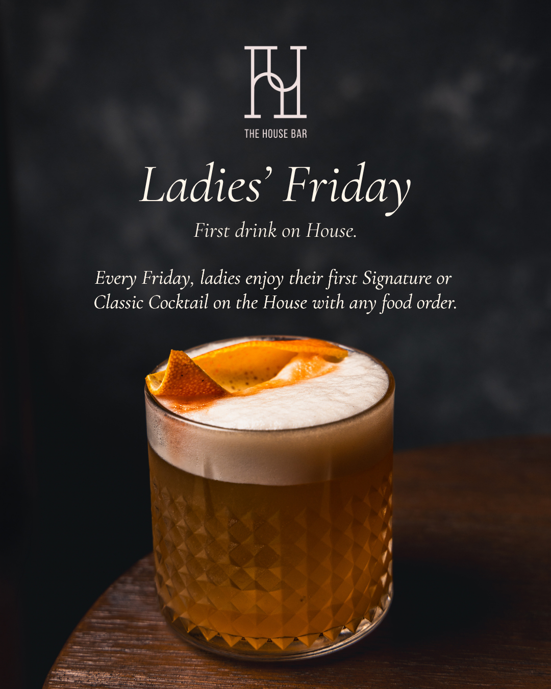 Friday deserves a proper start. Ladies receive their first Signature or Classic Cocktail on the House with any food order.