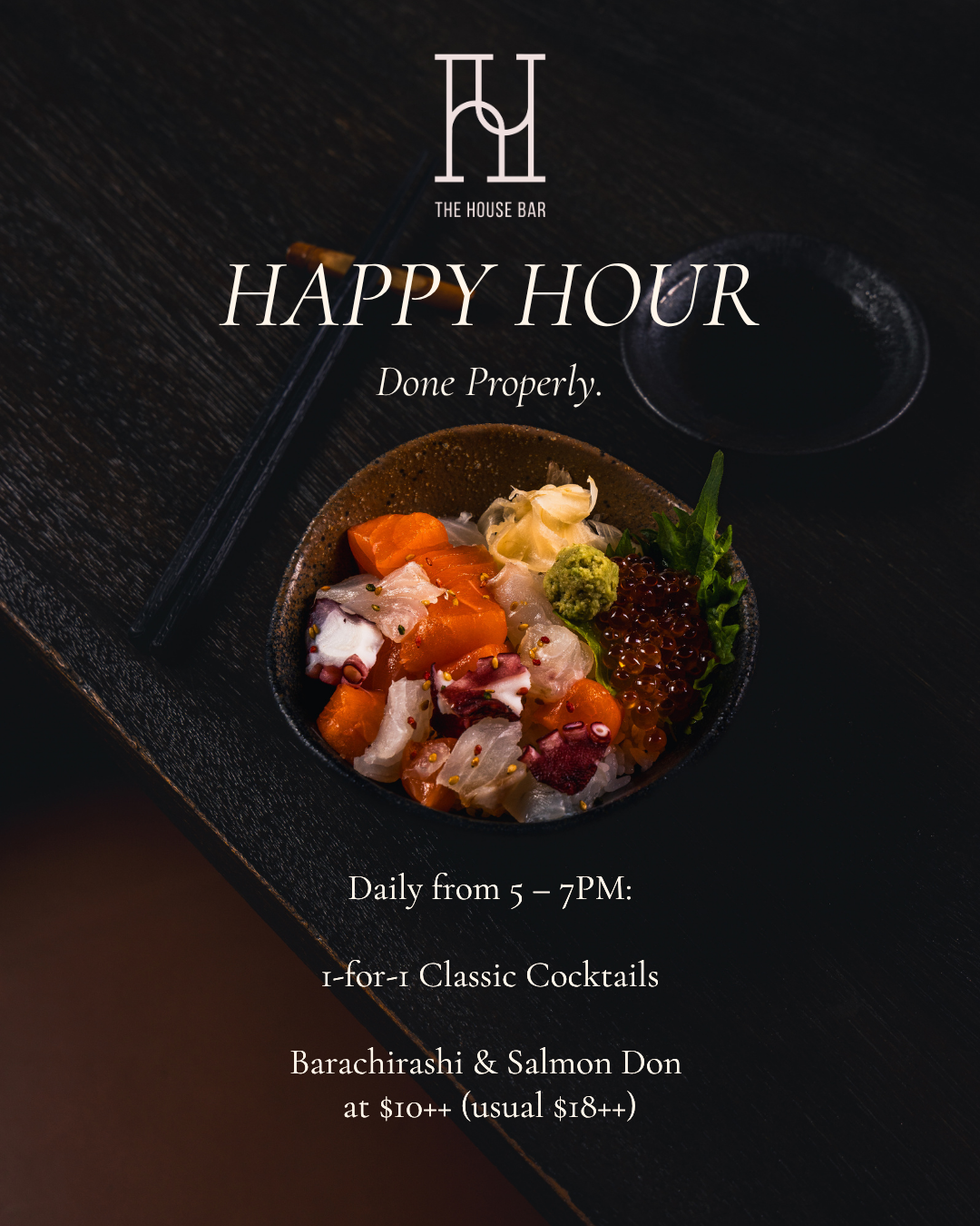 The first two hours are the best ones. Join us from 5pm for 1 for 1 Classic Cocktails ($24++) and our Barachirashi and Salmon Dons ($10++) every day we're open.